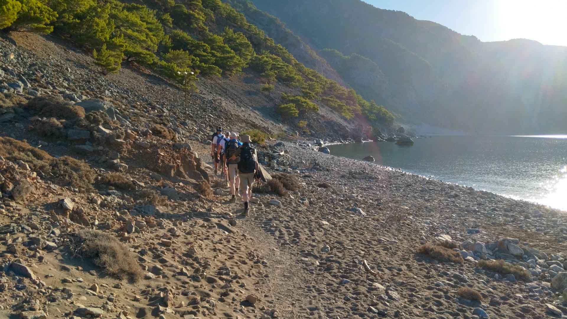 Ξεκινάμε νωρίς το πρωί κατά μήκος του παραθαλάσσιου μονοπατιού που ενώνει την Παλαιόχωρα με την Σουγια και μέσω του ευρωπαϊκού μονοπατιού Ε4 φτάνουμε στην Αρχαία Λισσό. Έναν από τους πιο γοητευτικούς αρχαιολογικούς χώρους της Κρήτης, διάσημο κέντρο υδροθεραπείας κατά την ελληνιστική και ρωμαϊκή εποχή. Αφού κολυμπήσουμε στα βαθιά γαλάζια νερά της Λισσού, συνεχίζουμε για να φτάσουμε στο παραθαλάσσιο χωριό της Σούγιας, όπου θα διανυκτερεύσουμε.
